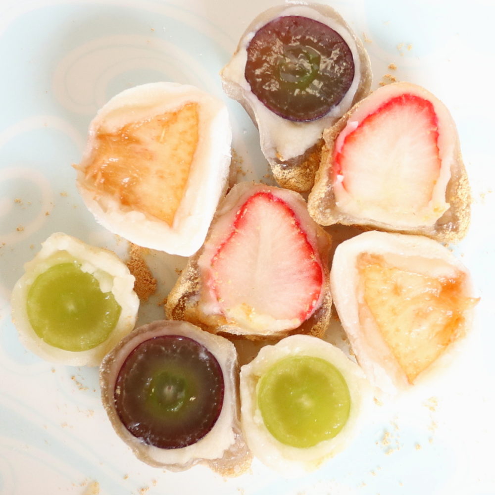 もち麦粉が入った餅生地で黒糖味の餡を包んで麦粉を散らしています。