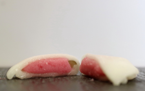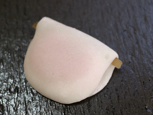 一般的な花びら餅はほぼ半円なんですが、川口屋さんはちょっとのっぺりとした形。うっすらと見える桜色がかわいらしいです。