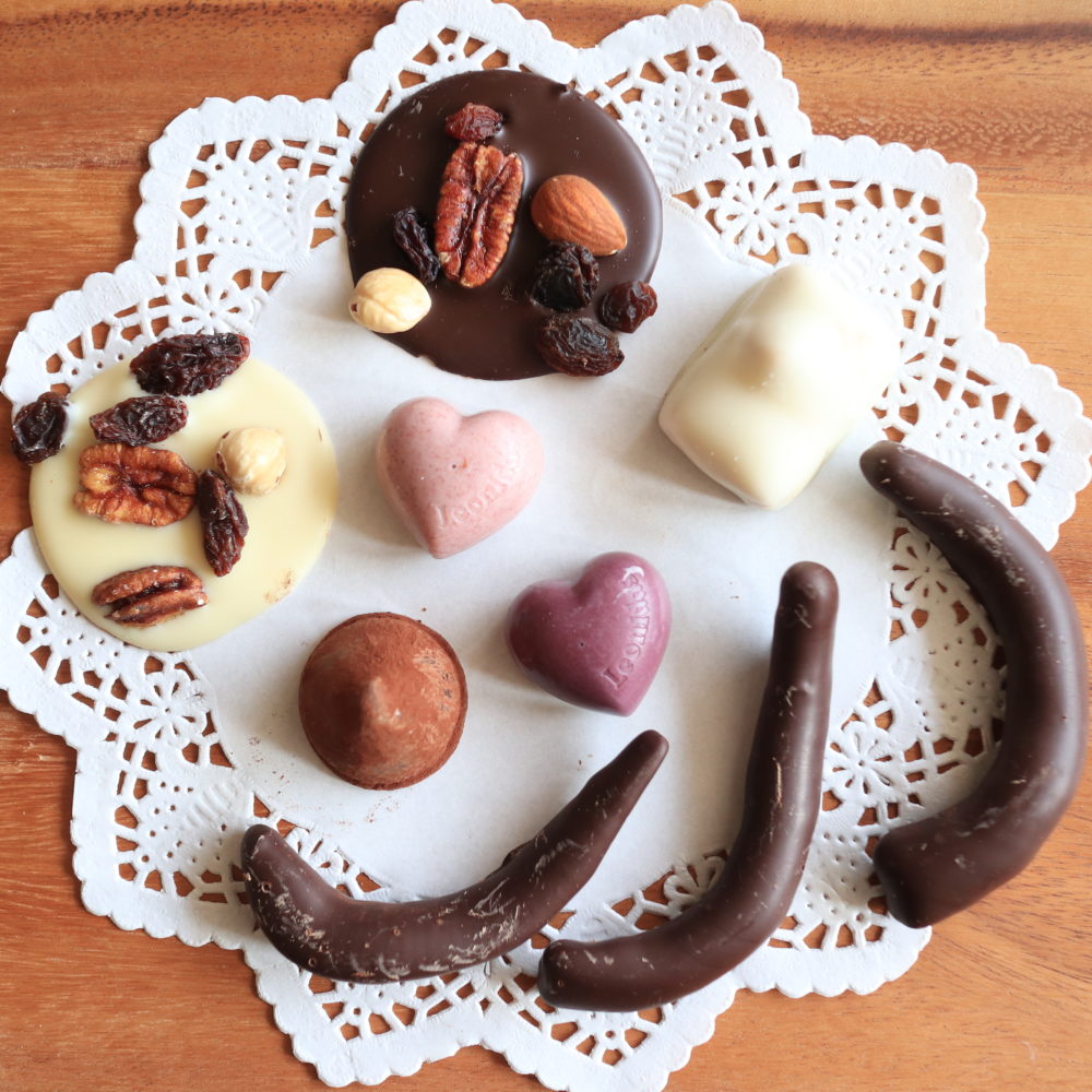 世界的にも希少なカカオ「ホワイトカカオ」と水で作ったガナッシュにソースを閉じ込めた、独創的な形のボンボンショコラ。