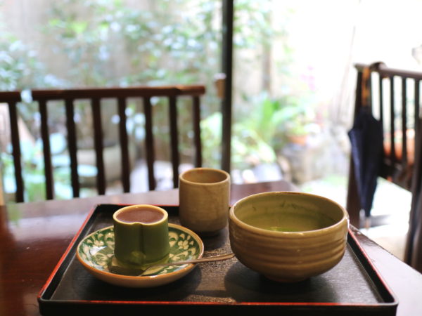 お抹茶を点てる音がほのかに聞こえ、しばらくするとお抹茶と水ようかんが運ばれてきました。