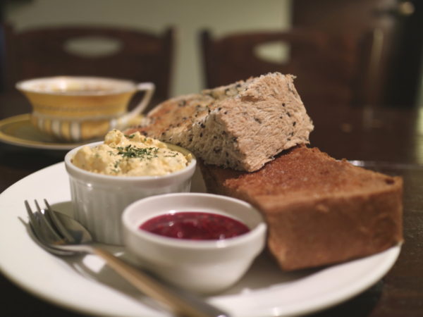 『黒ゴマトーストと黒糖トーストのハーフ&ハーフモーニング』(500円)、分厚い黒ゴマパンと黒糖パンのトースト、つぶし玉子のタマサラ、自家製ジャムがついてきます。