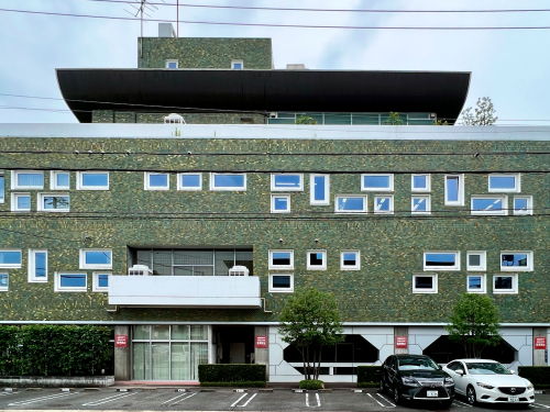 1963年(昭和38年)竣工、グラデーションのグリーンのタイルにランダムに配置された窓が個性的でファンも多い近代建築物。