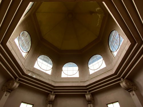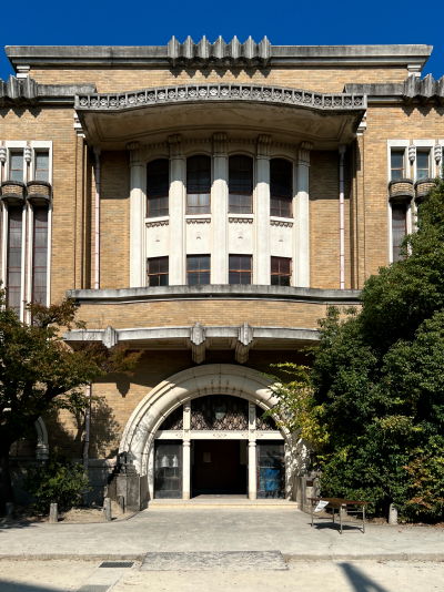 1931年(昭和6)竣工、2階へ続く大階段に5つのアーチが印象的、左右の柱の上の幾何学模様の半球ドームをそれぞれ4羽の鷲が囲んでいる。