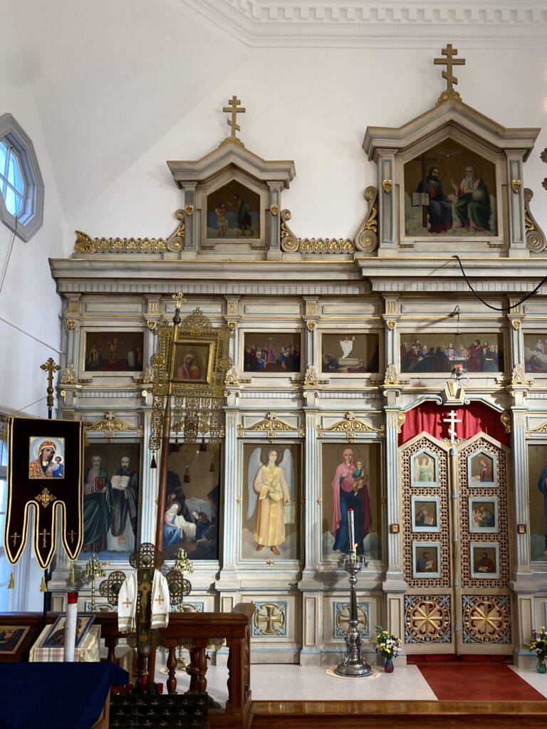 聖堂に入ると正面には要所に金粉を配したロココ調の優美な聖障に目を奪われる。 創建当時にロシアから取り寄せたガス燈やシャンデリアも圧巻。