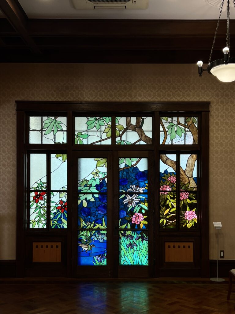 ホールの華やかなステンドグラスはほぼ当時の姿で保存されており、他の部屋にも多くのステンドグラスを見ることができる。