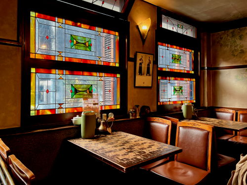 名古屋で初めて自家焙煎をはじめた老舗の喫茶店『コーヒーショップKAKO 花車本店』、ステンドグラスのやわらかな光がさすアンティークな店内。