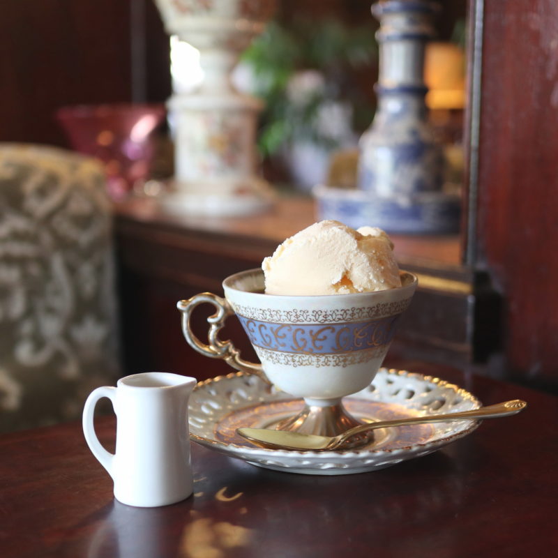 アンティークな家具や調度品並ぶ落ち着いた大人の空間、おすすめの「コーヒーゼリー」はほろ苦いコーヒーゼリーとアイスクリームにリキュールをたっぷりかけていただきます。