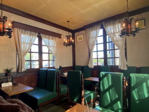 目印はブルーの瓦屋根、レースのカーテンも王道のレトロ純喫茶の雰囲気ですね。