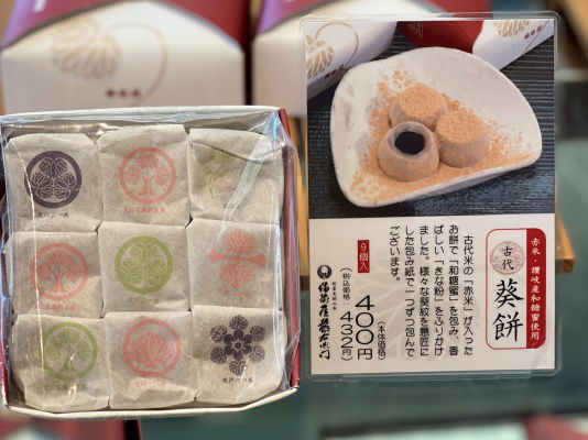 『古代 葵餅』、古代米「赤米」が入ったお餅に「和糖蜜」を包んできな粉をふりかけています。