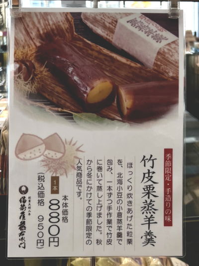 『竹皮栗蒸羊羹』、北海道小豆を使い手作業で竹皮に巻いて蒸しあげてるんですって。
