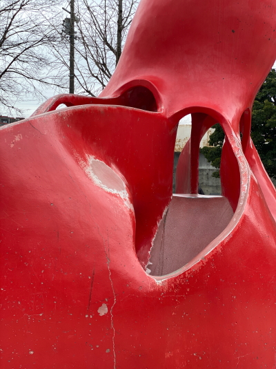 真っ赤な滑り台は隠れ家みたいに複雑なフォルムで楽しそう、昭和の遊具は遊び心があって楽しいよね。