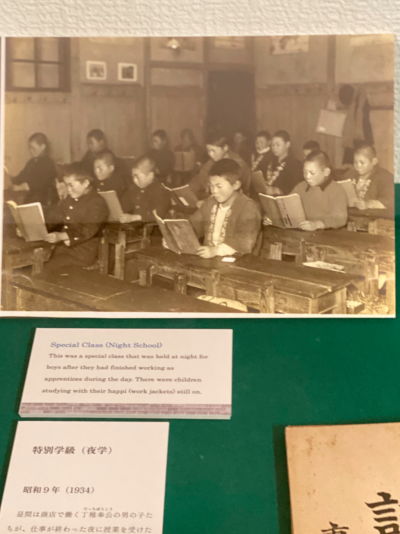 法被を着たまま授業を受ける少年、丁稚奉公で働いていても学べるようにと夕方にも授業が行われていたそうです。