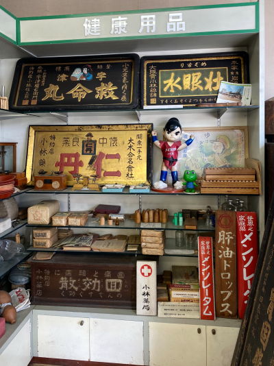 長野の善光寺表参道途中にある小林薬局の前を通ると、店先から古い看板などがガラス越しみ見え「まちかどミニ博物館」なる看板も見えたのでお声をかけて見学させていただきました。