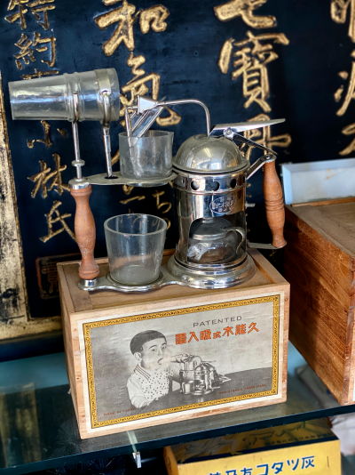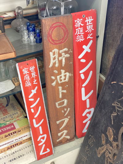 店内には所狭しと古い看板や調剤道具などが並び圧巻。