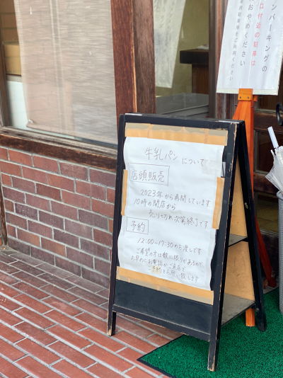 今回は到着時間もわからなかったのであきらめてたんですが、お店の前の「牛乳パン、当日キャンセル分あります。」の貼り紙をみて店内へ! ラスワンの牛乳パンをお買い上げしてきました。
