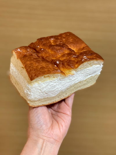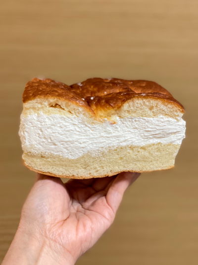 生クリームがパン生地と同じくらいの量でズッシリくるのも納得、パンの焼き色もよし。