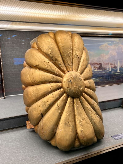 館内には三笠に関係する様々なものが展示されており、こちらは艦首に飾られていた「菊の御紋」、かなり大きいです。