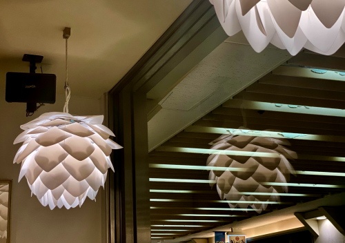 中から見ても照明がすてき、ペムラムが重なってるみたい。