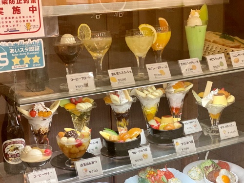 店頭のショーケースには食品サンプルが並び、ドリンクから名古屋グルメまで揃っています。