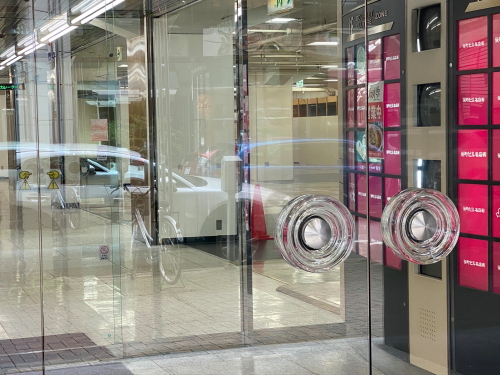 アクリルの丸ハンドルのガラスドア、創業当時はかなりクールなイメージだったんでしょうね。