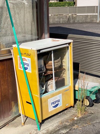 日本鉱泉近くの路地に放置された冷蔵ショーケース、シールが「PEPSI」。