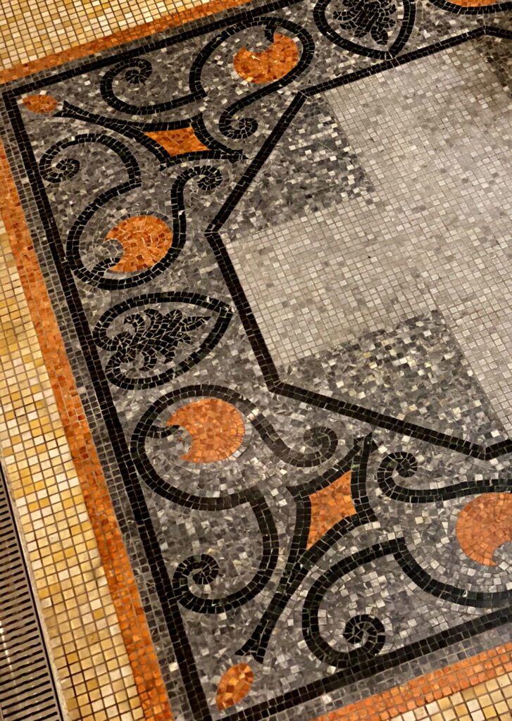 地下へ続く階段の先には、絨毯のような見事なタイルが。壁・床・柱まで総タイルの贅沢な空間は必見です。