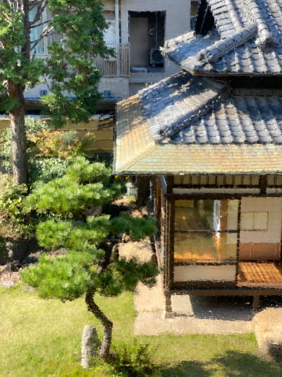 旧娯楽室から見る和館、部屋の窓がレトログラスのため揺らいでみえます。