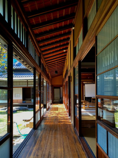 中庭を臨む渡り廊下、L字に広がっています。