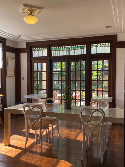 エントランスを入った左手はカフェになっており、ステンドグラスの大きな窓から庭を眺めることができます。