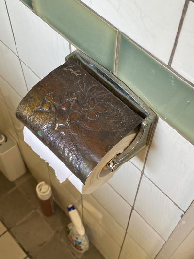 入ってすぐにある受付の前にトイレがあり、「トイレットペーパーホルダーがすてきよ。」と押していただきました。