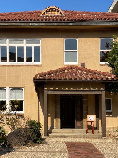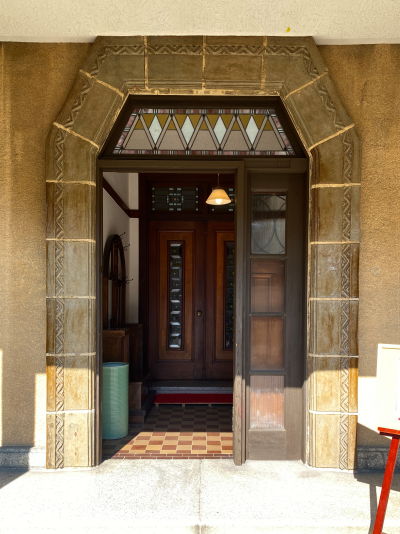正面エントランスはホワイトとブラウンのアールデコ風の洋館、大正建築らしい温かみを感じます。