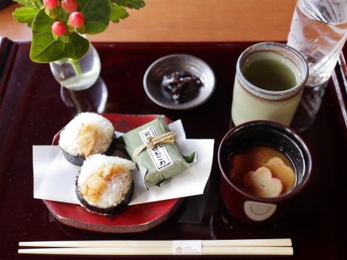 天むす2個、飛騨牛おこわ、お味噌汁、やわらかく煮たきゃらぶき、お茶がついてきました。
