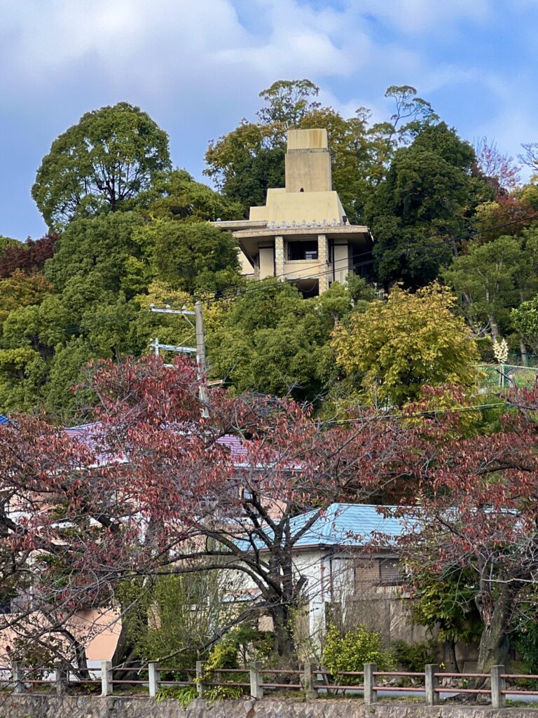 芦屋川駅から川沿いの道を上がっていくと坂の上にヨドコウ迎賓館がチラリと見えます。